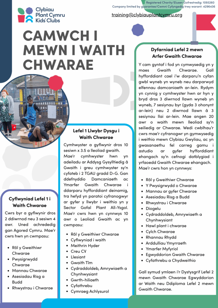 Lefel 1 Llwybr i Waith Chwarae: Mae’r cymhwyster hwn yn cael ei gyflwyno dros 10 sesiwn, ac yn cynnwys profiad gwaith. Mae’n adeiladu ar addysg sy’n gysylltiedig â gwaith i greu cymhwyster sy’n cyfateb i 2 TGAU ar radd D-G, gan ddefnyddio damcaniaeth Gwaith Chwarae ac arfer i gynnig hyfforddiant deinamig, gan hefyd paratoi cyfranwyr ar gyfer y llwybr i weithio yn y sector Gofal Plant All-Ysgol.