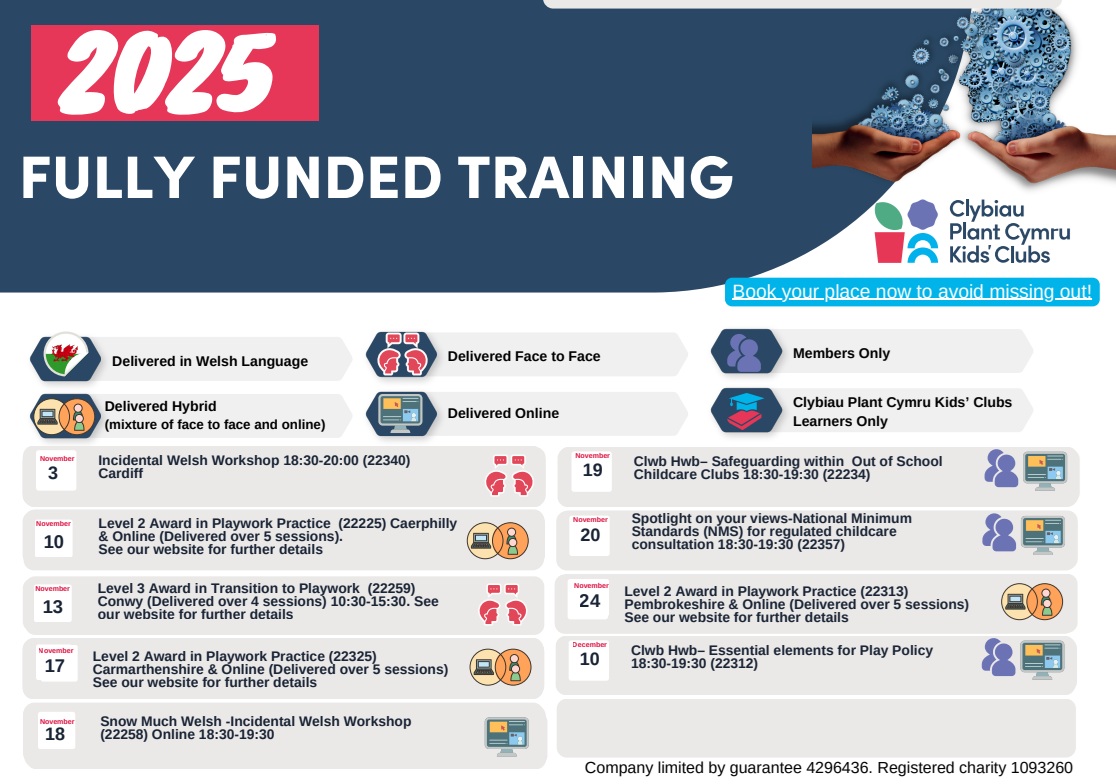 Clybiau Plant Cymru Kids’ Clubs is experienced at developing and delivering workshops and qualifications to improve the quality of care, play and learning provided to children in clubs. Clybiau Plant Cymru Kids’ Clubs is an approved centre with the Awarding Organisation, CACHE, for the delivery of accredited Playwork and Assessing qualifications.